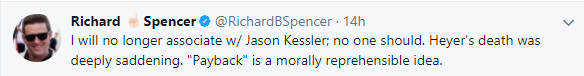 Richard Spencer distanced himself from Kessler not because “Payback” is morally reprehensible but because it was announced publicly.