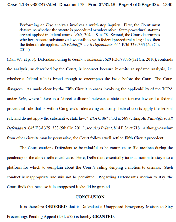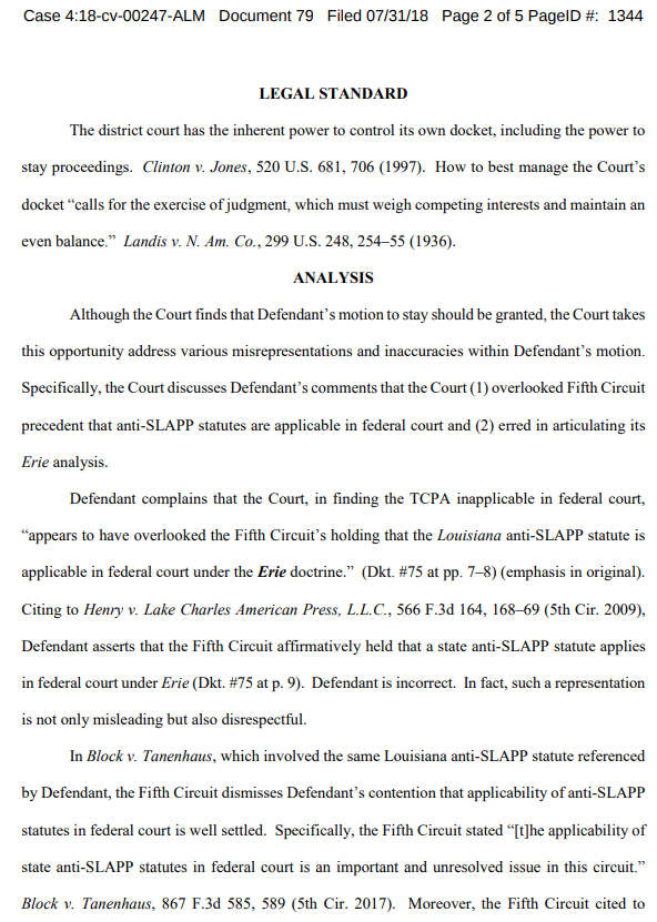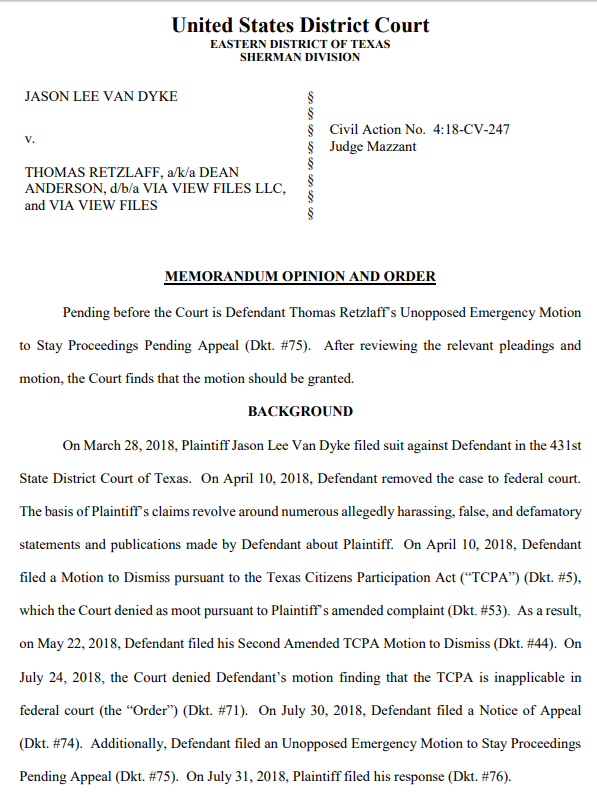 That’s why Retzlaff and his lawyer, Dorrell, filed their motion for an emergency stay. They hope to force the court to make a definitive decision on whether TCPA applies in federal court or not. Jason Van Dyke didn’t oppose the motion since he too, wants this issue resolved once and for all.