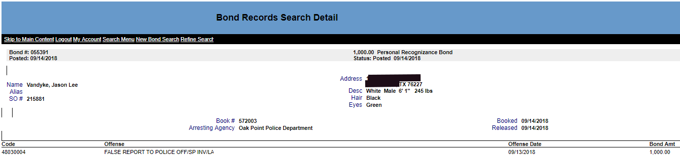 The cops were neither fooled or convinced, so they arrested Jason for filing a false police report and held him in jail with a $1000 bond.