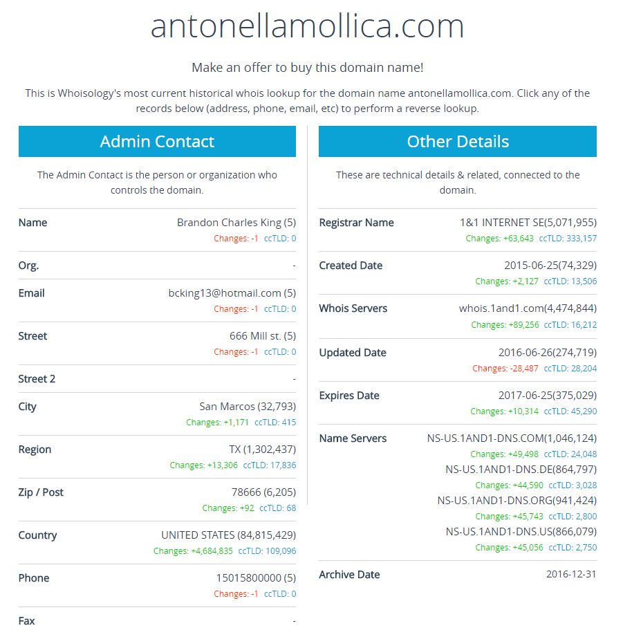 The domain name AntonellaMollica.com is currently a private registration but it was originally registered by Brandon King.